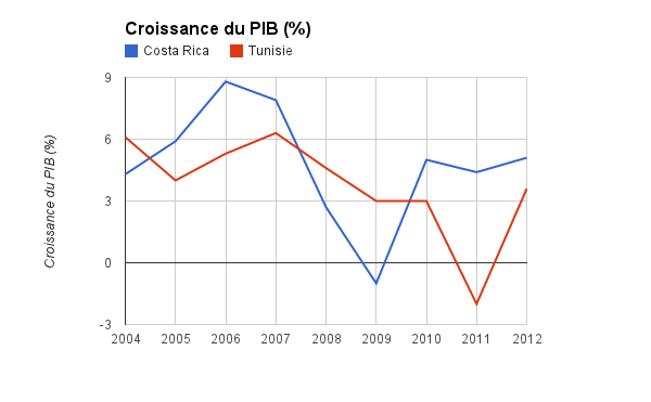 Les deux chutes de la croissance sur le graphique s’expliquent probablement par la crise financière américaine de 2008 pour le Costa Rica et par la révolution de 2011 pour la Tunisie.